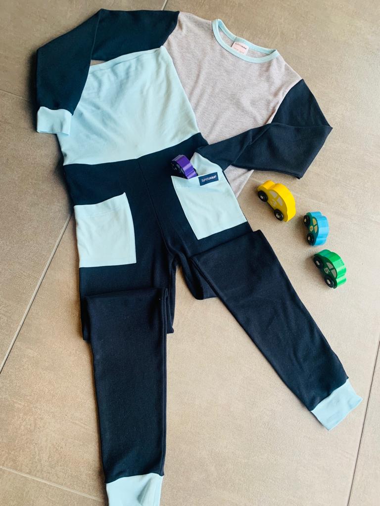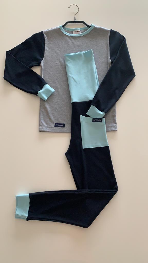 Entdecken Sie den Superjama Jungen – ein Meisterwerk aus hochwertiger natürlicher Baumwolle in Rippstrick- und Stretch-Jersey-Qualität, handgefertigt in der EU. Der elegante graue Design mit raffiniertem Hellblau und der verlängerte, eng anliegende Hosenbund schützen Ihren kleinen Schatz vor Kälte – selbst in unruhigen Nächten. Exklusiv für gesunden Schlaf und unvergleichlichen Komfort.